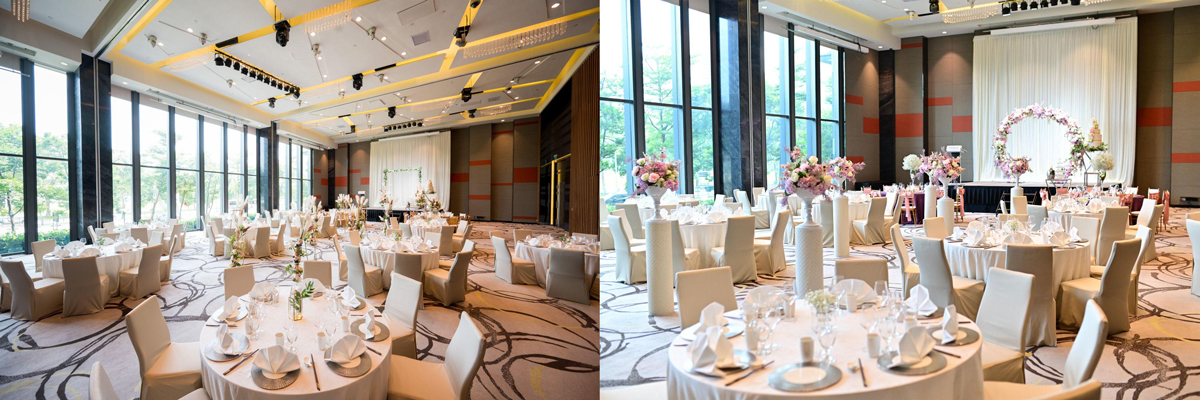 The Sky Ballroom embodies a light and pristine elegance. The ballroom boasts floor-to-ceiling windows and high ceilings, allowing for an abundance of natural light and a delightful view overlooking Nicoll Highway.