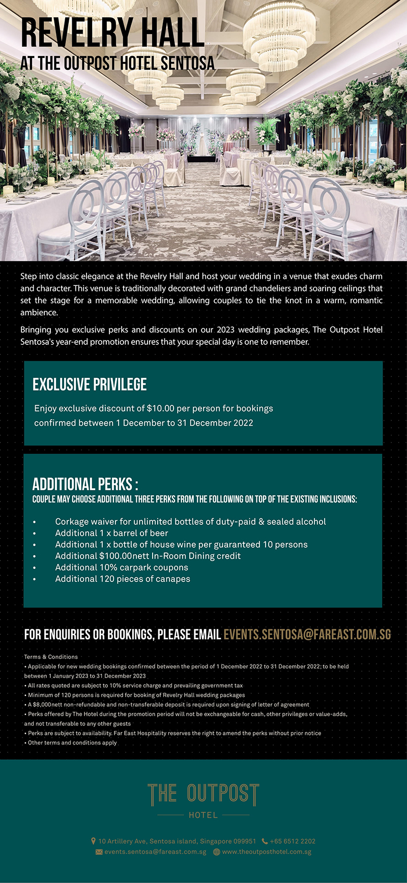 Enjoy an exclusive discount of $10 per person and a line-up of attractive perks including an additional barrel of beer, an additional bottle of house pour wine per guaranteed 10 persons, additional 120 canapes, and more, when you confirm your wedding between 1 to 31 December 2022.