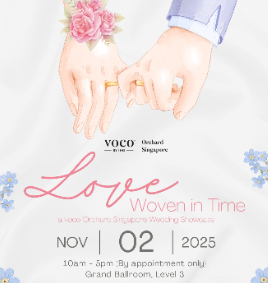 At voco Orchard Singapore, we believe every chapter of your love story deserves a radiant beginning. From the gentle charm of intimate vows to the grandeur of lavish celebrations, your wedding day will be nothing less than extraordinary. Couples who confirm their wedding during the showcase will enjoy exclusive perks and savings worth over $12,888, along with a chance to receive additional rebates up to $888 through our sure-win lucky draw. Highlights: Exclusive on-day sign up perks | Sure-win lucky draw for couples who confirm their wedding package during the showcase | Wedding themes showcase | Tasting portion of wedding menu | Wedding planning masterclass by I Do For You (wedding planner) at 1pm and 3pm | Wedding partners showcase by Dreamweaver, Star Florist, Yvonne Creative Bridal Event Details: Date: Sunday, 2 November 2025 Time: 10am to 5pm | By appointment only Venue: Grand Ballroom, Level 3, voco Orchard Singapore by IHG Hotel RSVP Here!